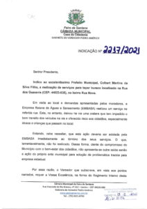 Em visita ao local e demandas apresentadas pelos moradores, foi verificado que após a Embasa realizar um serviço na referida rua, a empresa deixou na via uma cratera que tem impedido o deslocamento dos moradores. Diante situação exposta, o vereador fez uma indicação 2217/2021 ao prefeito Colbert Martins para que realize o serviço para tapar buraco da rua Guaranis, bairro Rua nova.