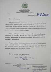 Pedro Américo solicitou Drenagem e Pavimentação da Rua Heráclito Dias de Carvalho, Campo do Gado Novo
