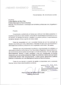 O vereador Pedro Américo volta a cobrar ao Prefeito Colbert Martins Filho, respostas sobre o Manifesto de Apoio pelo Reconhecimento e Valorização dos Bombeiros Profissionais Civis, Brigadistas e Socorristas.