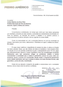 Vereador Pedro Américo cobra novamente ao prefeito Colbert Martins Filho, uma resposta ao Manifesto em Apoio a Cultura.
