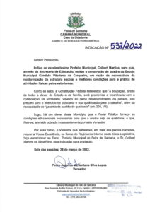 No exercício da sua função, o Vereador Pedro Américo solicita que seja iniciada a construção da quadra na Escola Municipal Cândido Vitoriano de Cerqueira, em razão da necessidade da modernização da estrutura escolar e melhores condições para a prática de atividades físicas pelos estudantes.